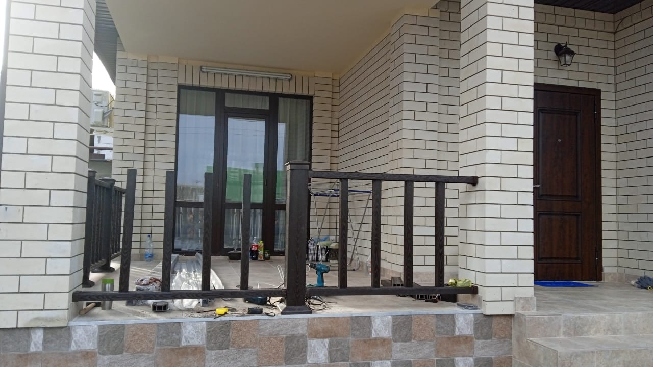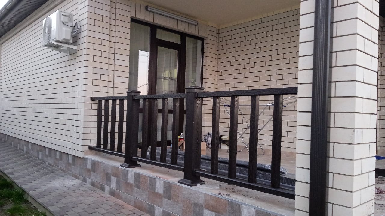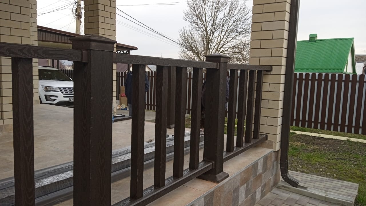 Произвели поставку и шеф-монтаж ограждения из ДПК NauticPrime (венге) на открытой площадке входной группы частного дома и перила для ступеней.